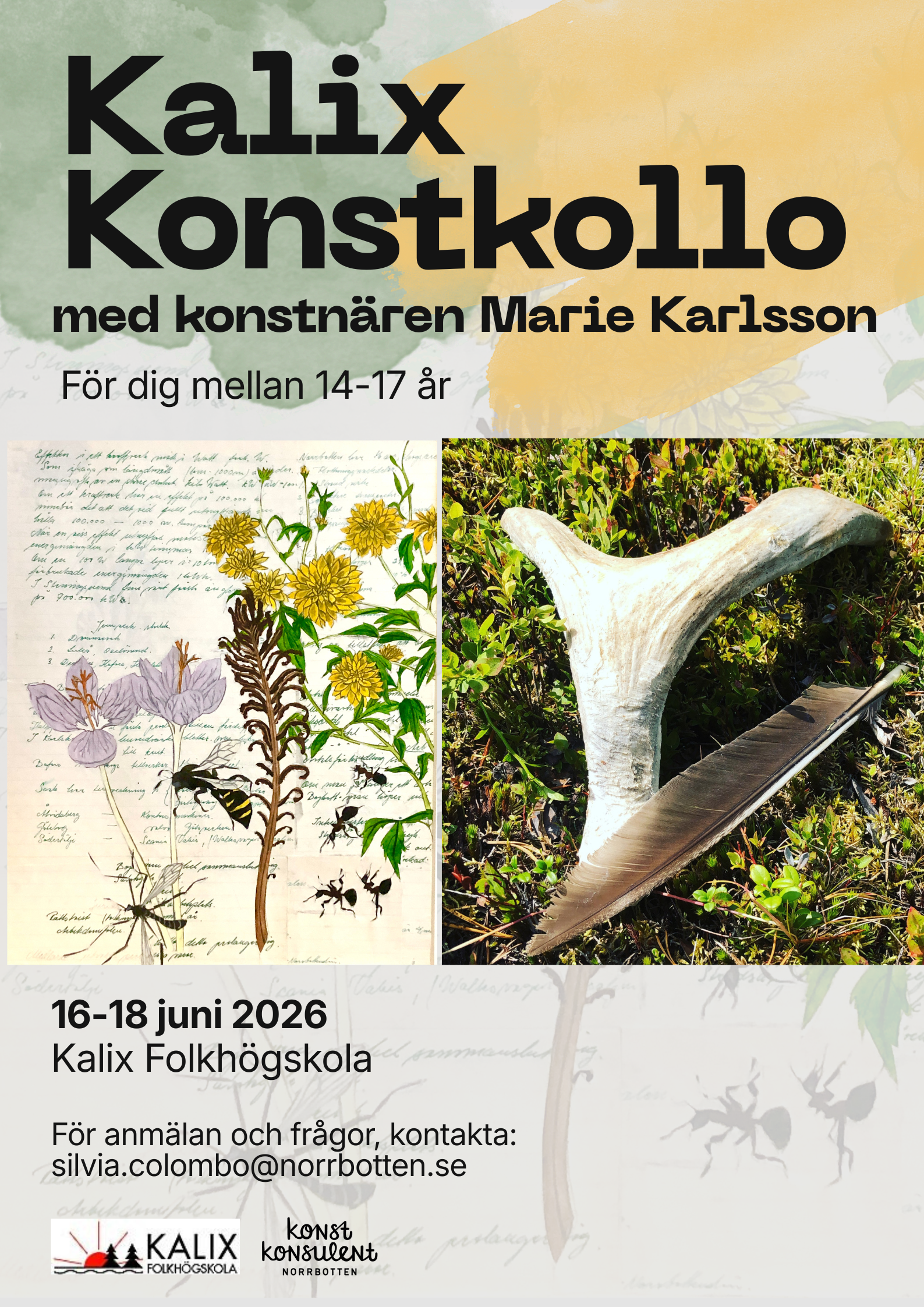 Är du mellan 14 och 17 år och nyfiken på konst?Nu har du möjlighet att delta i Kalix konstkollo i juni, på Kalix Folkhögskola! Konstnären Marie Karlsson kommer att inspirera och guida deltagarna un...